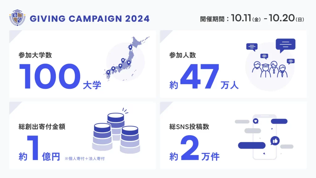 10月11日より10日間開催した、日本最大級 “学生による” 資金調達イベント「Giving Campaign 2024」(文部科学省後援)が無事終了いたしました。短い開催期間ではありましたが、約47万人の方にご参加いただき、約1億円の寄付が集まりました。ご参加いただきました全ての方に感謝いたします。