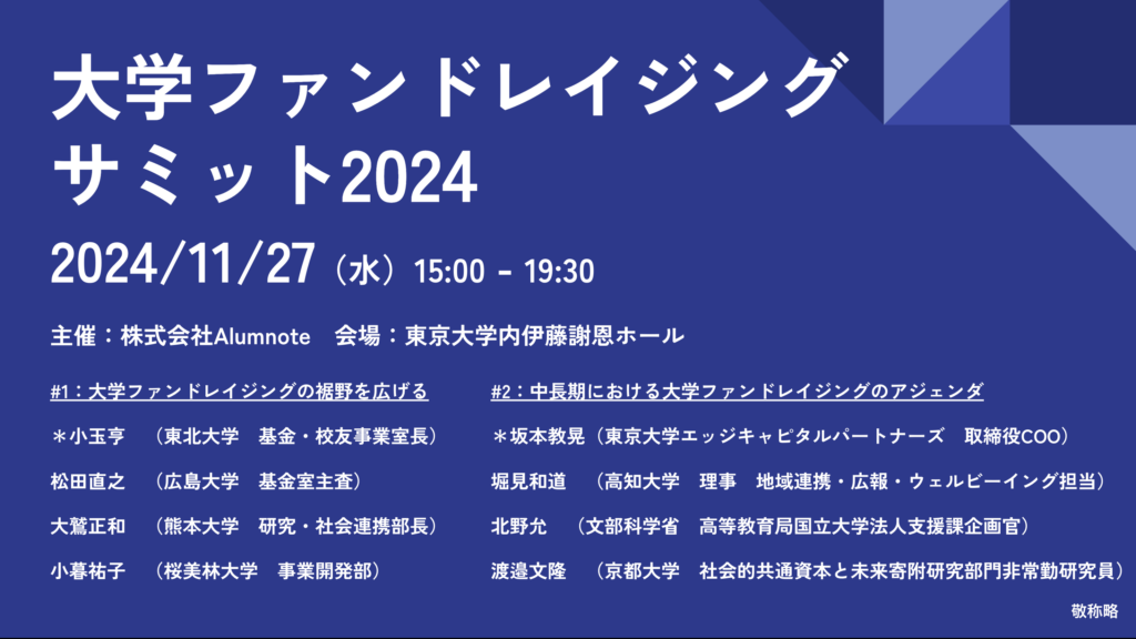 Alumnote主催、大学の資金調達について産学官が共に議論する「大学ファンドレイジングサミット2024」開催決定